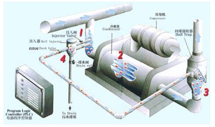 1、電腦程序控制器啟動清洗循環(huán),將注射閥門打開,控制特殊球進入冷凝器循環(huán)系統(tǒng); 2、尺寸比管道稍大的軟質材料制成的特殊球通過冷凝器,將冷凝器管壁上的水垢和污垢帶走; 3、特殊球通過冷凝器后,被回收器接收; 4、電腦程序控制器打開排水閥門,球自動回到球注入槽,槽中的水自動將特殊球進行清洗、排污、排水閥門關閉,完成一次循環(huán)。遵此電腦程序每天進行36次循環(huán)清洗。 |