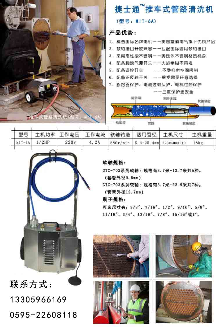 國內(nèi)首創(chuàng)中央空調(diào)冷凝器清洗軟軸緩解裝置.清洗機(jī)軟軸造價(jià)昂貴但同時(shí)又極易損壞,這成了所有工程人員面臨的巨大難題.我公司在2006年即成立軟軸科研項(xiàng)目小組,不斷提高軟軸材質(zhì)并多次人工模擬極端惡劣環(huán)境進(jìn)行試驗(yàn).同時(shí),科研人員在07年底設(shè)計(jì)出軟軸緩解裝置,該裝置在軟軸卡住的情況下將電機(jī)輸送力度減小%60,這樣可以有效的保護(hù)軟軸.這一技術(shù)在08年得到了完善并于09年正式面市.精選的材質(zhì)和獨(dú)到的保護(hù)裝置使軟軸使用壽命延長一倍以上. 二, 刷頭工具采用上等材質(zhì)精致而成,刷頭種類更多,刷毛有效長度增加,清洗效率也大大提高.刷毛的材質(zhì)直接影響到清洗的效率而刷頭的整體尺寸更是影響到軟軸的動(dòng)力傳輸.刷頭選用不合理很可能造成軟軸卡在銅管里,嚴(yán)重時(shí)軟軸將直接斷掉.我公司技術(shù)人員多次分析比較不同規(guī)格刷頭的使用效果,進(jìn)而設(shè)計(jì)出清洗效率更高同時(shí)對(duì)軟軸力度傳輸影響又最小的刷頭規(guī)格. 三, 主機(jī)采用多級(jí)控制電路.該技術(shù)可保證主機(jī)的使用連續(xù)性,保證用戶的清洗工程不會(huì)因?yàn)闄C(jī)器不能使用而耽誤.